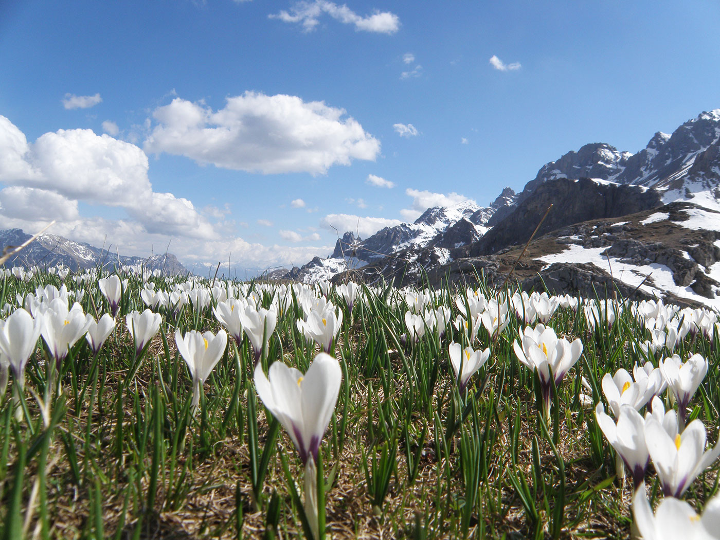 En mai, les jours s’allongent, les fleurs commencent à disputer la place à la neige, et quelques marmottes pointent leur nez.
