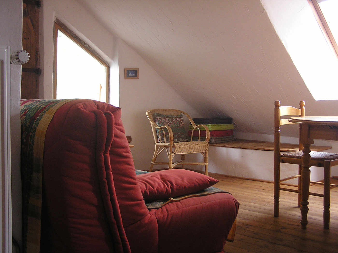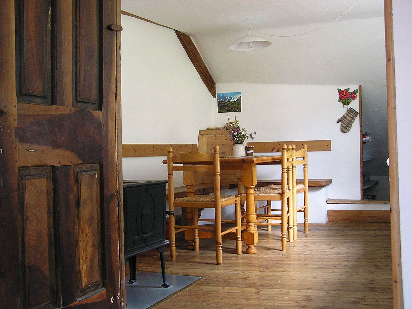 – La pièce à vivre, avec un coin salon et une banquette-lit (2 lits jumeaux en 80), et un coin cuisine où l’on mange, avec un poêle à bois pour les soirées mouillées.