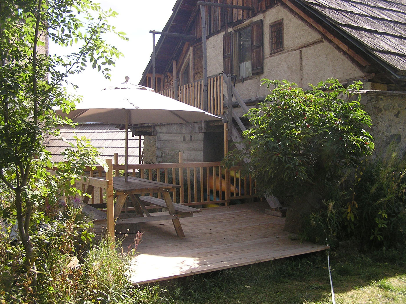 L’ accès se fait par un balcon, avec un escalier extérieur partant de la terrasse en rez-de-jardin, où il y a table, bancs et parasol.