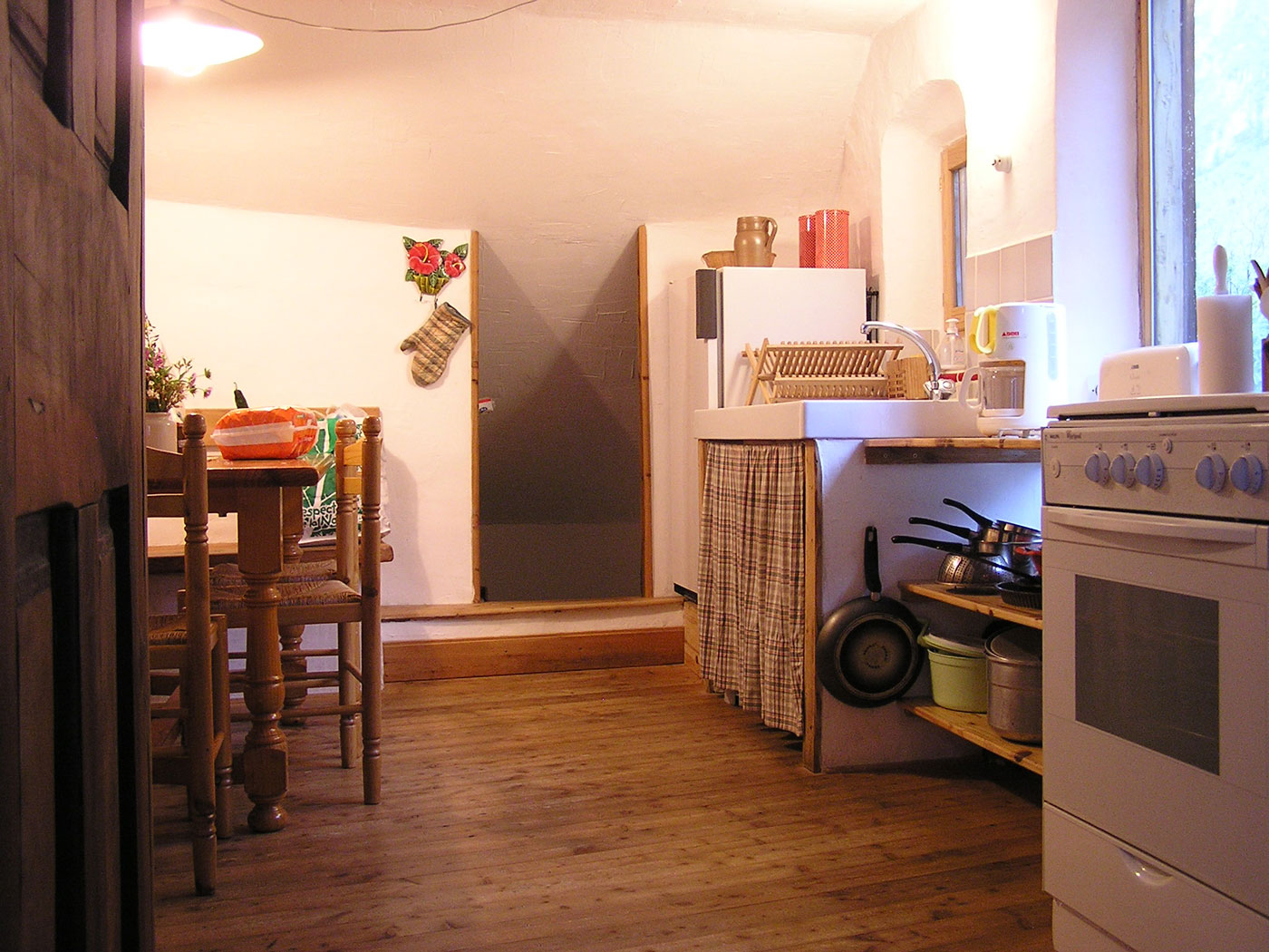 La cuisine est équipée de : gazinière, petit four électrique, micro-ondes, frigo, congélateur, batterie de cuisine (+ cocotte-minute), cafetière électrique, bouilloire, grille-pain, mixer, vaisselle 10 couverts et les ustensiles nécessaires, nous espérons que tout y est ! A noter qu’il y a de l’eau de source au robinet…